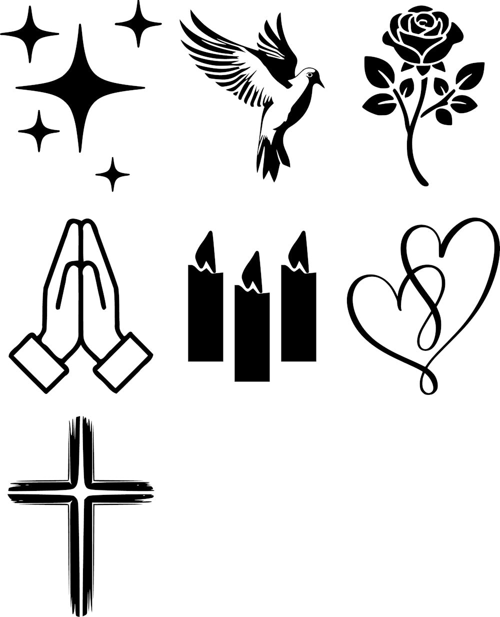 Customise with up to 7 lines (up to 30 characters per line). Optional icons: Dove, Rose, Cross, Candles, Praying Hands, or Heart.